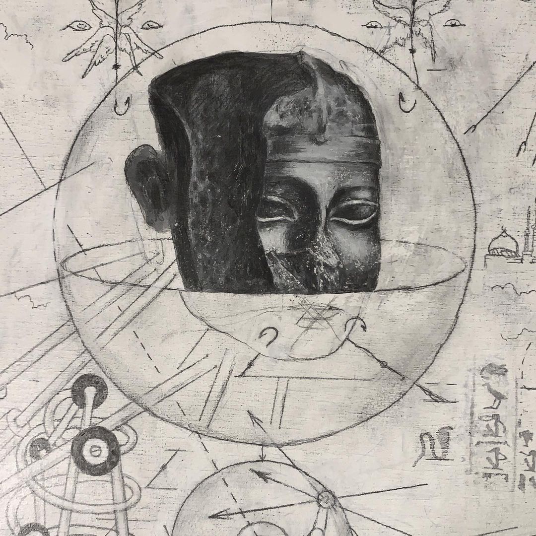 B&W gesso, graphite & matte medium on wood panel 24x24”. Private commission.